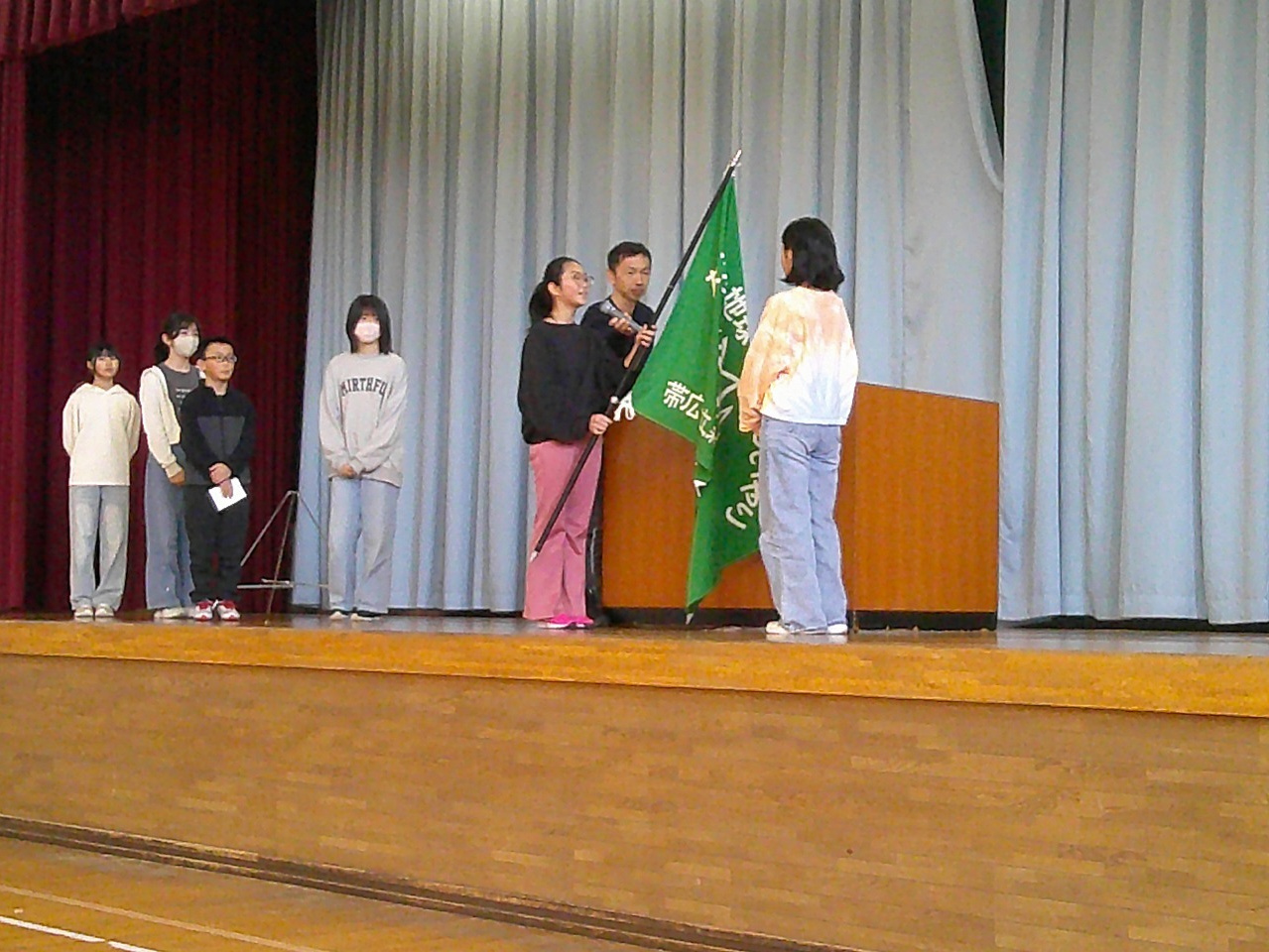 児童会活動の1年間の締めくくりとして、全校集会が行われました。各委員会の委員長からは、一年間の活動報告と反省が発表されました。現三役の役員たちからは、1年間の活動を振り返っての発表があり、先の選挙で当選した新三役の役員は、それぞれ抱負を発表しました。現児童会長から、新児童会長へ児童会旗が渡され、森の里小学校児童会のバトンが渡されました。
