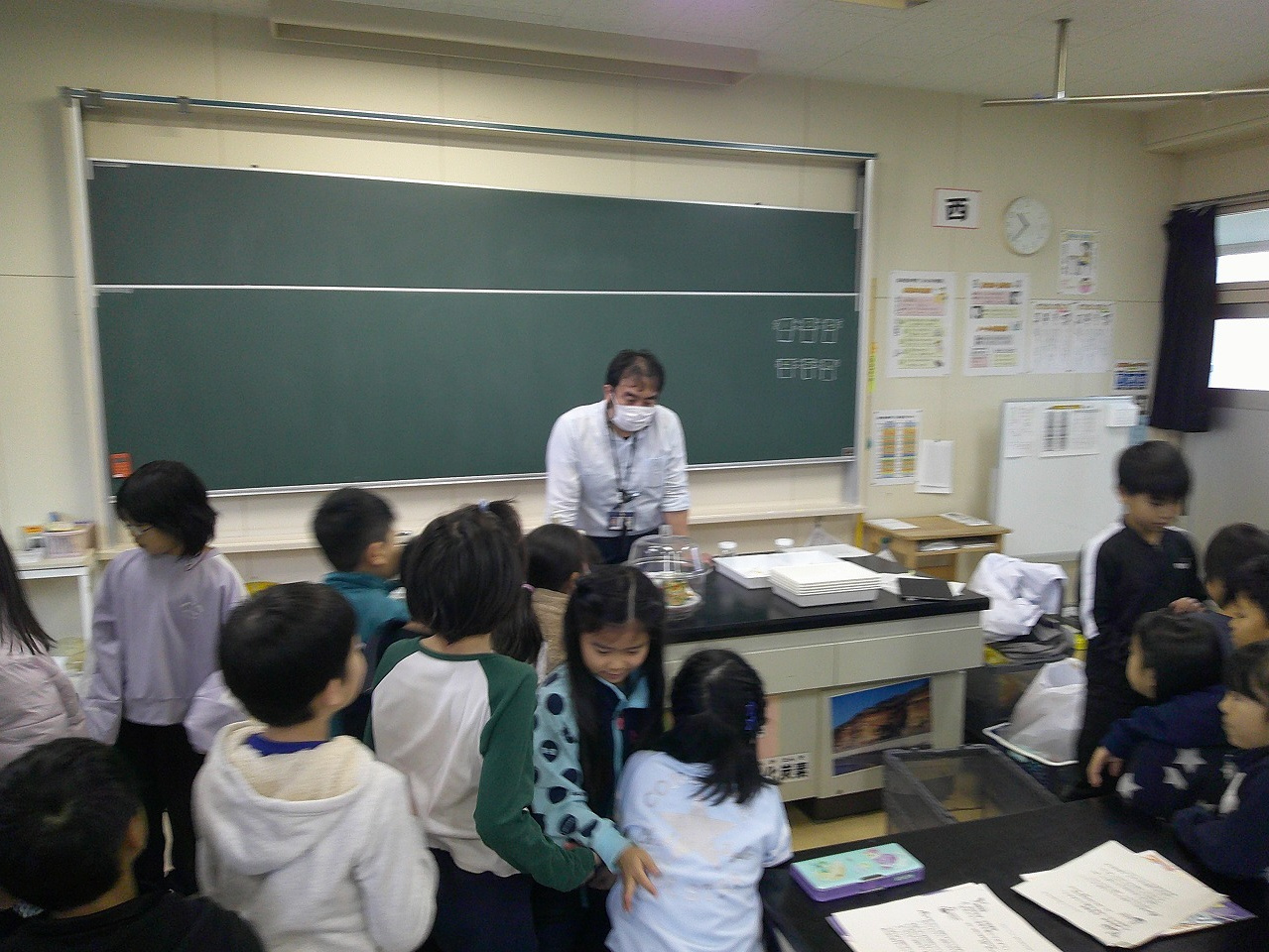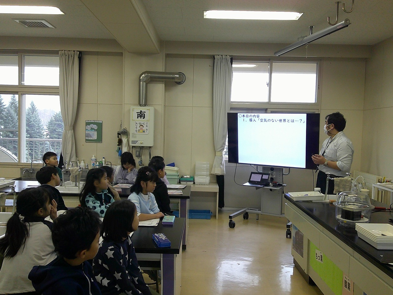 釧路高専より講師の方をお招きし、「空気のない世界」について、真空実験機を使った授業をしていただきました。「空気がなくなると、風船はどうなると思う?」「しぼむ?」「ばくはつする?」、「空気がなくなると、音は伝わると思う?」など子どもたちは、予想しながら実験に取り組み、空気のない世界について考えを深めることができました。