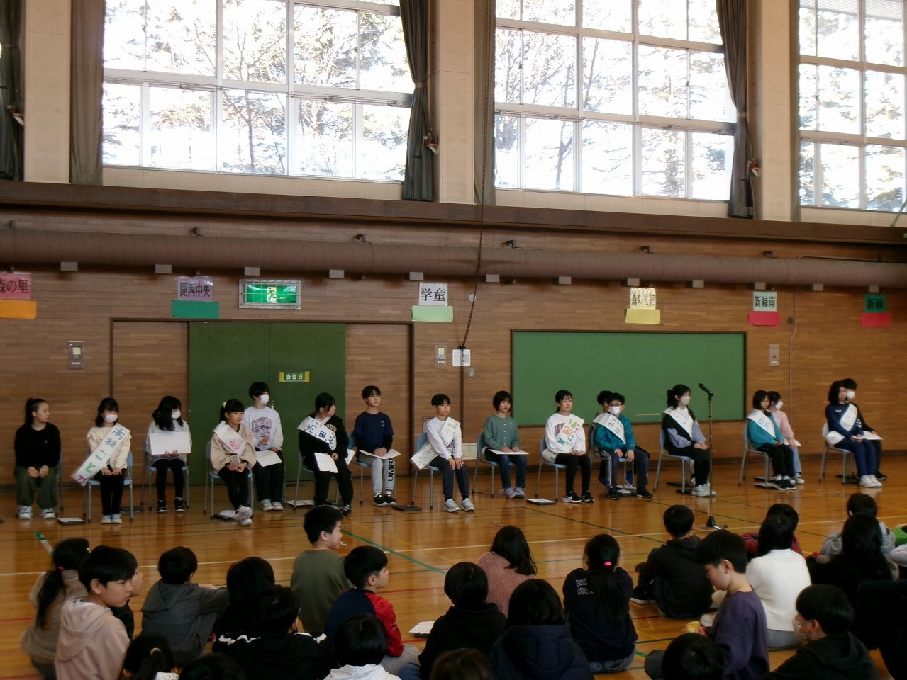 児童会役員選挙の立会演説会が行われました。候補者の子ども達が、これまでの選挙活動の締めくくりとして、自分の実現させたい森の里小学校像を熱く語り、その他の児童たちは真剣に話を聞き、誰がふさわしいかを考えて投票することができました。