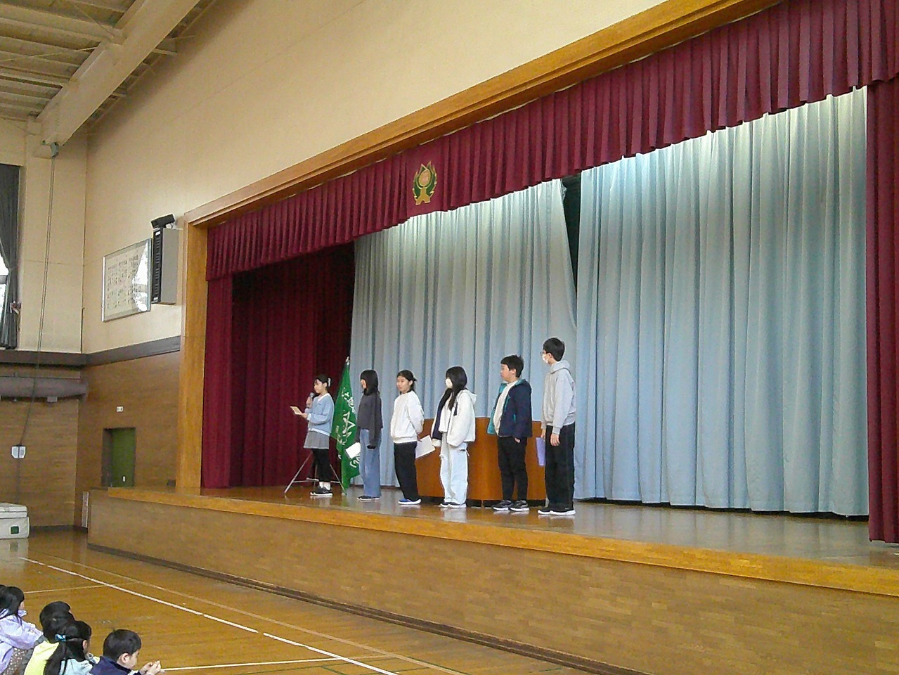 児童会活動の1年間の締めくくりとして、全校集会が行われました。各委員会の委員長からは、一年間の活動報告と反省が発表されました。現三役の役員たちからは、1年間の活動を振り返っての発表があり、先の選挙で当選した新三役の役員は、それぞれ抱負を発表しました。現児童会長から、新児童会長へ児童会旗が渡され、森の里小学校児童会のバトンが渡されました。